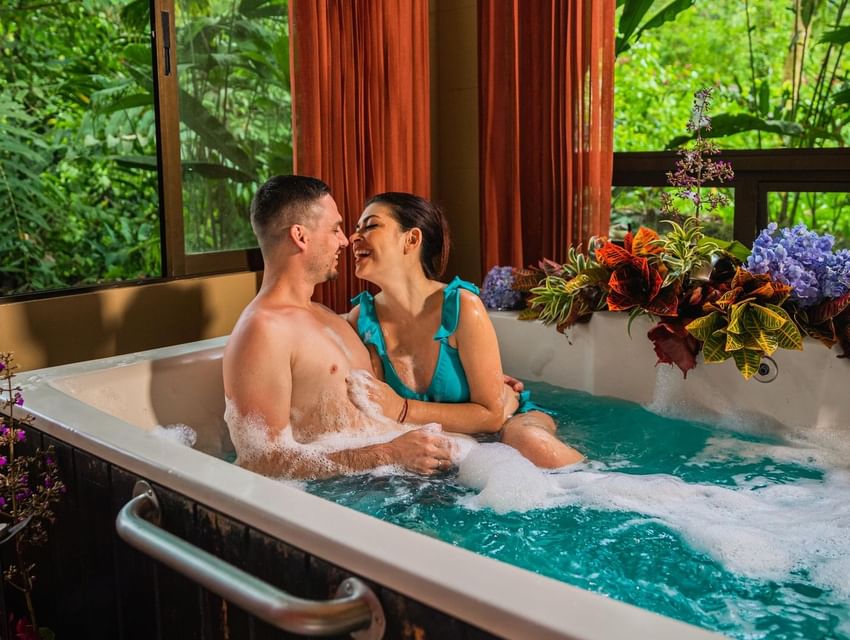 Disfrute de un baño privado en nuestros jacuzzis decorados con flores y plantas exóticas de nuestro jardín, mientras disfruta una deliciosa copa de vino.